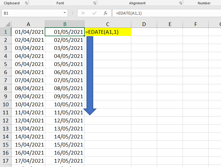 Option 1) Using the formula =EDATE(A1,1)