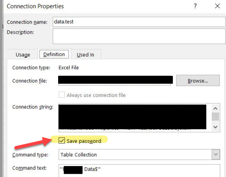 “Save password Select this check box to save the username and password in the connection file. The saved password is not encrypted. Clear this check box to log on to the data source, if a user name and password are required, the first time that you access it. This check box does not apply to data retrieved from a text file or a Web query.”