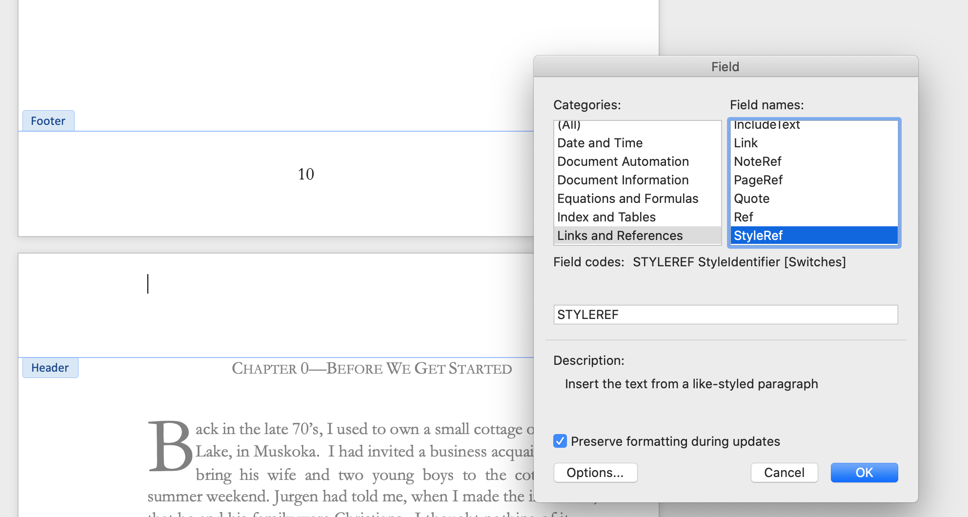 I can get to Header & Footer/Field/Links and References/StyleRef but no further (ref. screen capture).