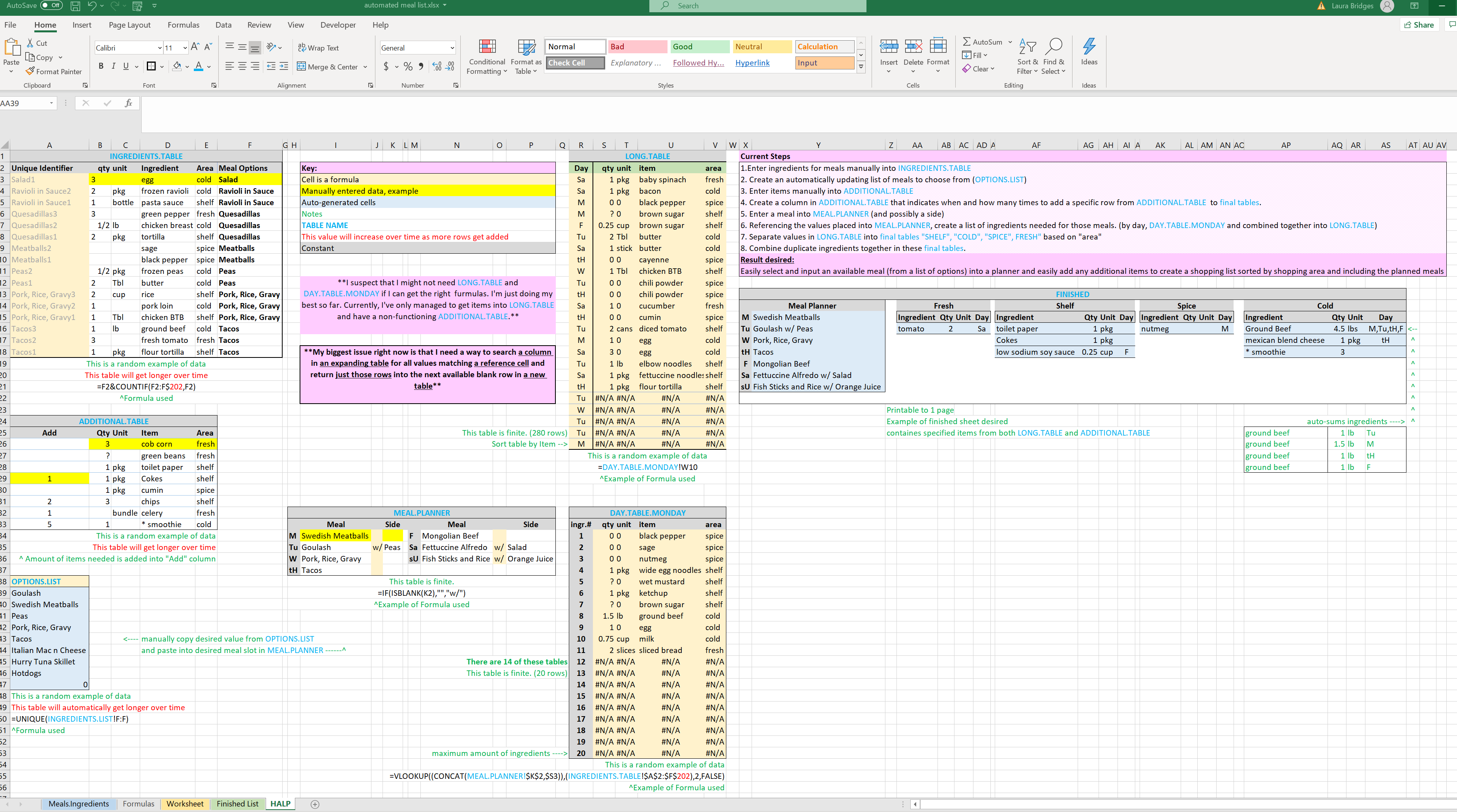 2.       Videos: The videos involve way more complicated/involved functions than I really want. I need the workbook to be easy (and enjoyable) to use. I prefer to manually type in new meal ingredients, I think. The idea of that huge grid table (from the first video link provided in the reply) seems really unpleasant to use.
