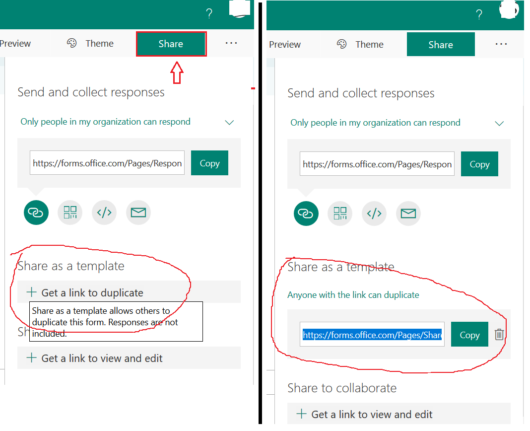 When another uses this link and paste it in a browser, they can see the form and once clicked Duplicate it at the top or bottom of the form  generate the sharing link to share a quiz as a template?