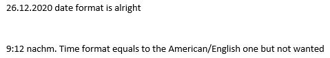 With the shortcuts ALT + SHIFT + D or ALT + SHIFT + T you can insert the current time and date in Word. So far so good, but unfortunately the American time format is displayed with 2x12h and this is also translated to german.