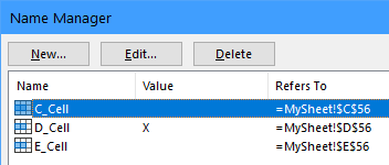 I have read online that using a named range could alleviate this issue although I have not discovered how this might work. I created a range in my spreadsheet for cells C56:E59 and named Metal_Options. I then want to treat each row as a group. If the user clicks on any cell in the row, it will have it's value set to "X" and then the other two cells in that row will have their values set to "". To do this there would have to be some way to reference each of the 12 cells in the range. I thought I might be able to identify specific cells within that range using Offset(), something like this: