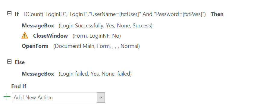 Login Button and I use If function with AND but it does not work, access alway open the main form to me he did not use "else"