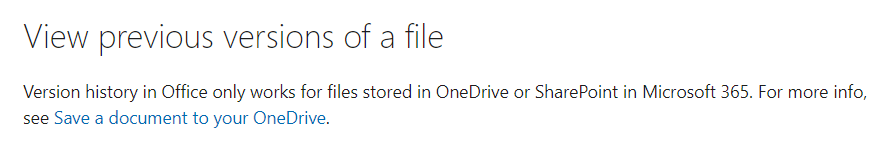 For the function of version history for a Word document or Excel workbook, it is only available to use when the file is saved in OneDrive or SharePoint. For your reference: View previous versions of Office files (microsoft.com)