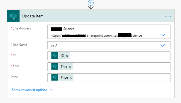 - Add action **Update Item, in ID filed, enter ID from When an Item is created or Modified Action.**In Price Filed, Enter Price column from Get Item Action (List2).