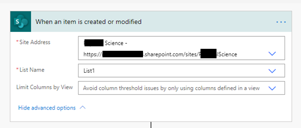 - Add Action: When an Item is created or Modified. Enter List1 here.