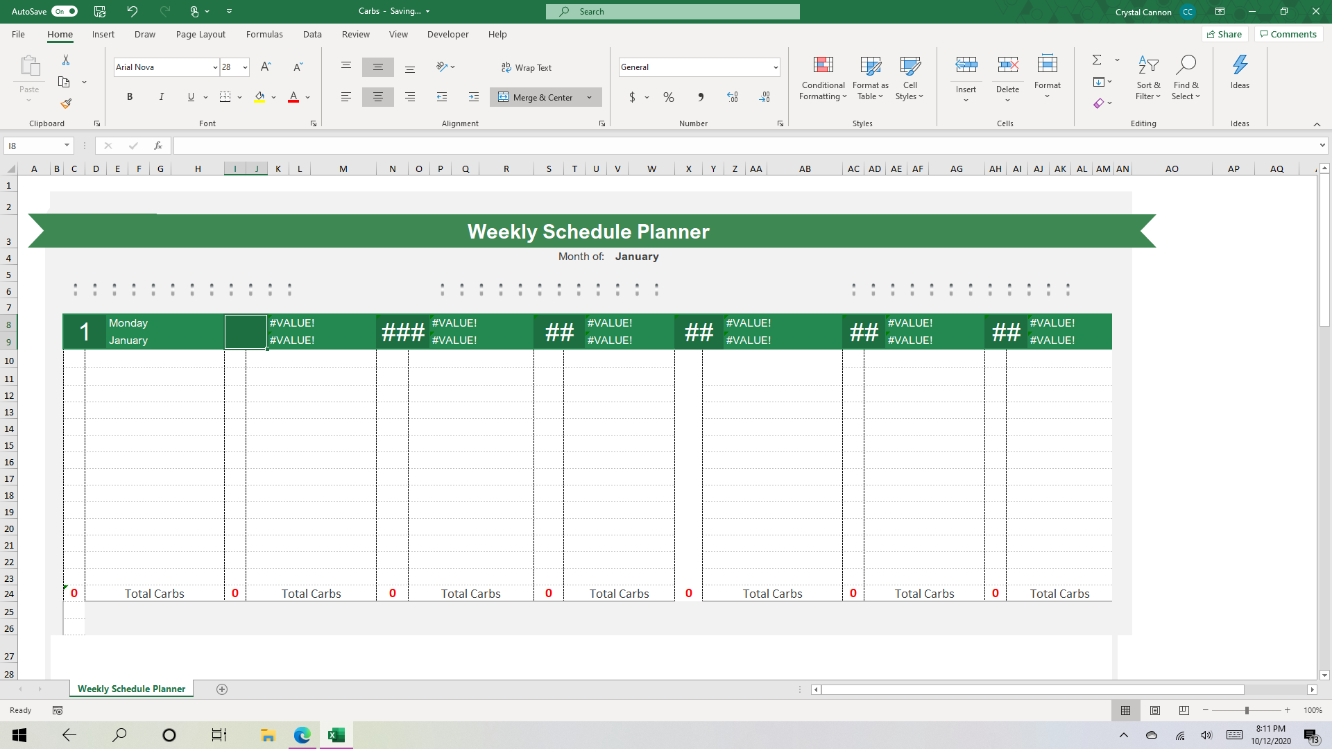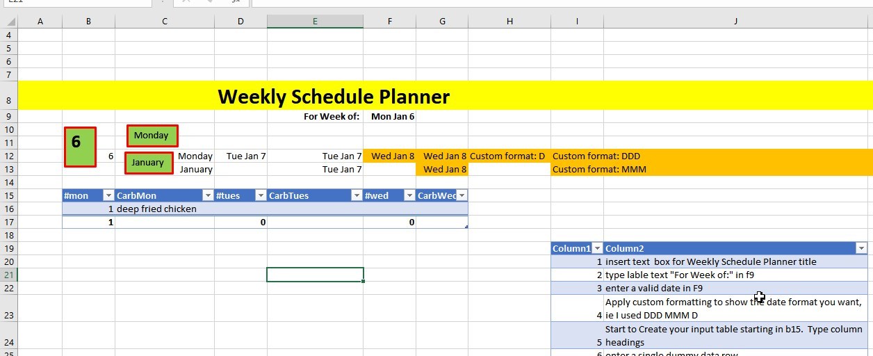 What column are you using to enter data between "day of week, day of month and "total carbs".