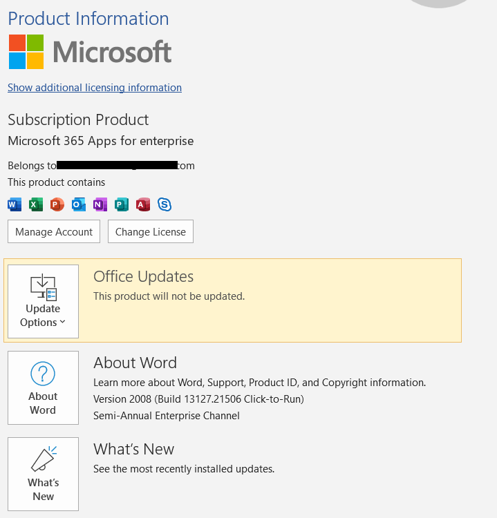 - Please provide the screenshot of Microsoft 365 Product Information. To get this screenshot, open Word or Excel on your system, click File>Account, capture the screenshot of all the information mentioned under Product Information.