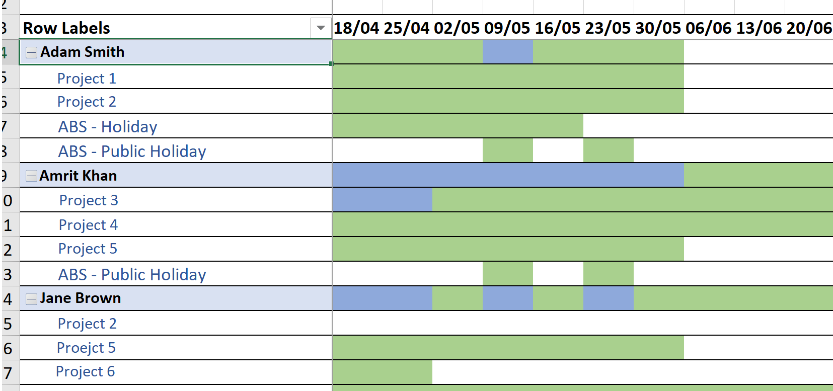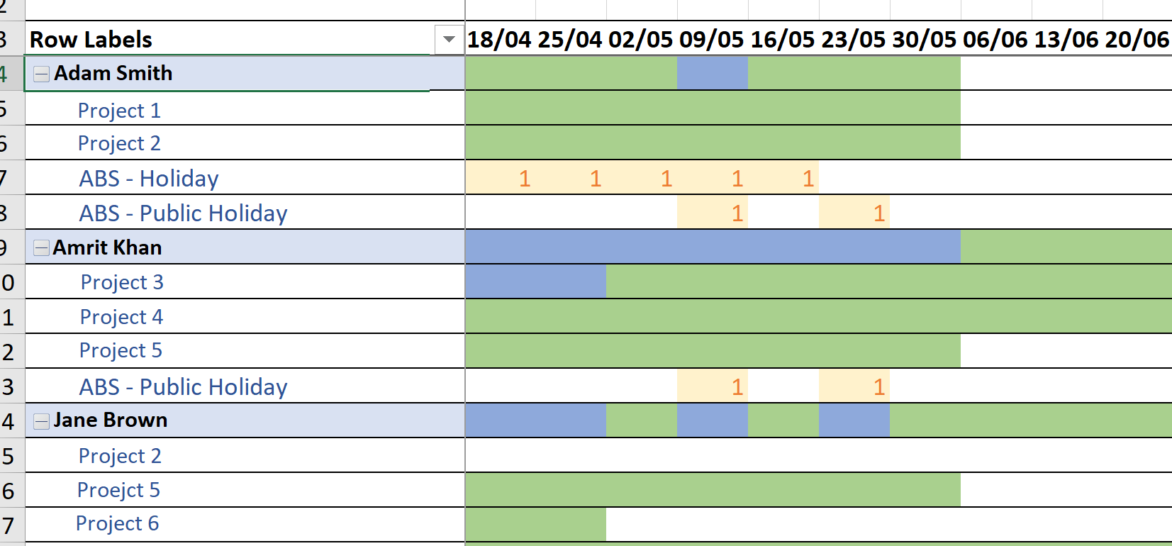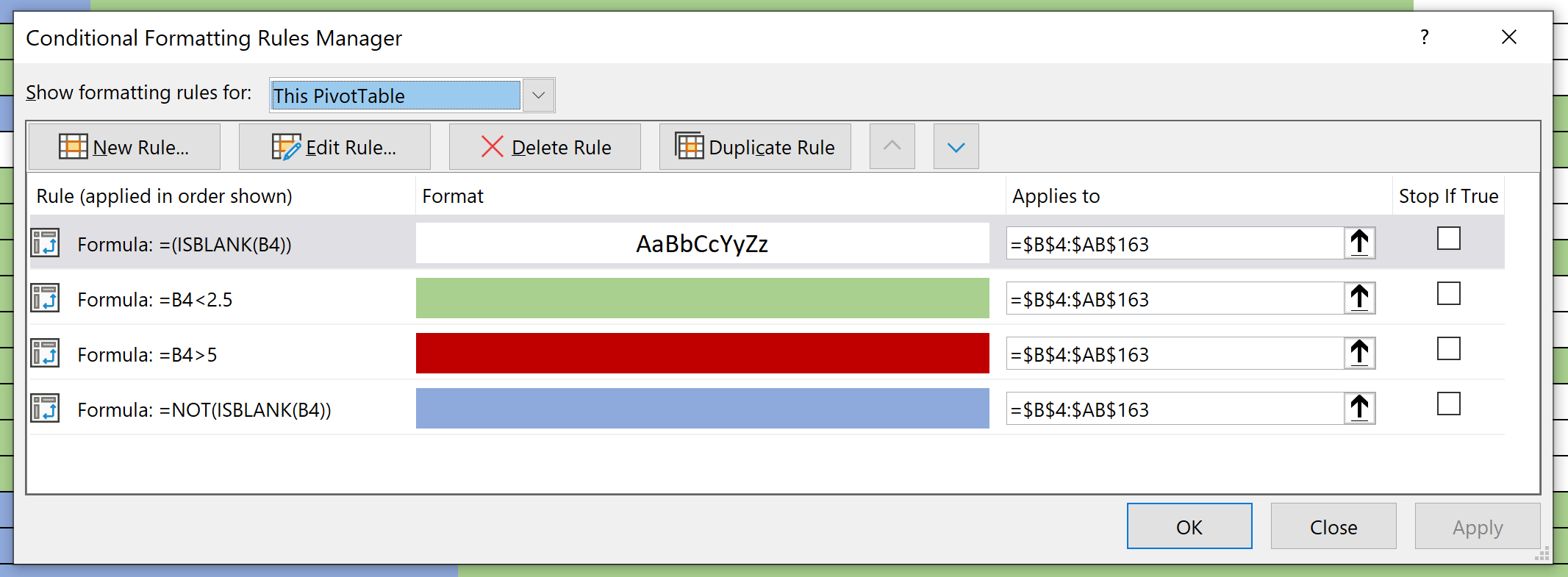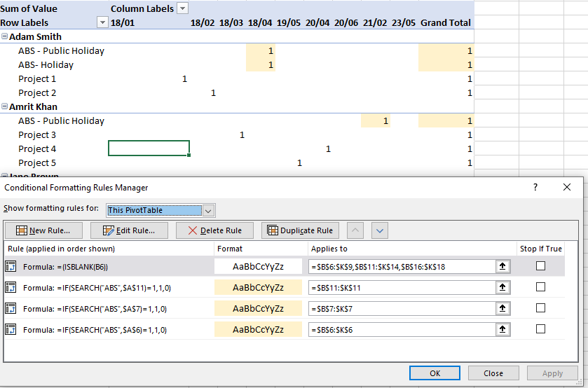 Moreover, the formatting of cells in column B, C, etc., depends on whether the cell in the Column A starts with ABS, as per my knowledge, we need to applying conditional formatting for each row. Like this: