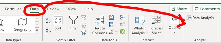 If the Analysis ToolPak has been installed, the Data Analysis icon will appear on the far right of the Data ribbon.