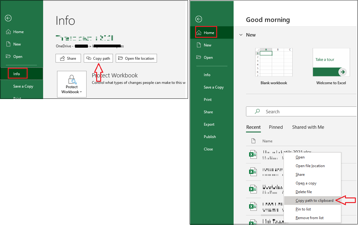 To find the path, open any Office file from the synced folder in File Explorer, let’s say you open an Excel workbook. Once the workbook is opened, click File>info>Copy path and paste this path to a notepad. Alternatively, you can click File>Home, under Recent list, find the file you want the path for, right click on it and click Copy path to clipboard from the context menu.