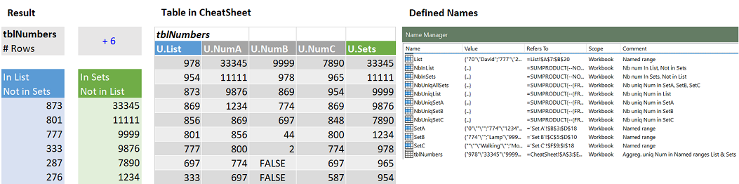• CheatSheet (can be hidden) with tblNumbers aggregates the unique numbers in SetA-SetC & List