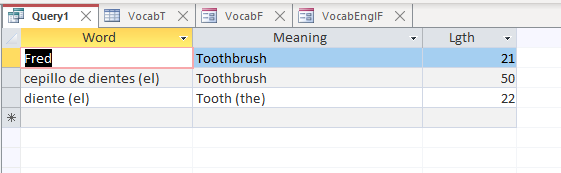 Thanks for the tip, I was using TRIM incorrectly - but using it as you showed still only returns 11 records. I then did what you suggested and extracted the length of the fields. Curiouser and curiouser! I created a new record and gave the word Fred with the meaning Toothbrush. Still no matches with like "T*" or trim ([Meaning]) like "T*". However, if I user like "*Tooth*" I get the following: