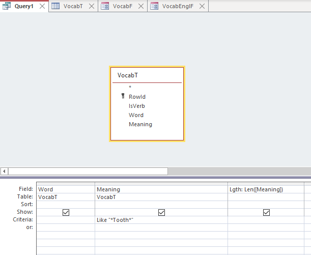 And lo and behold, NO toothbrush! I have checked there are no spaces at the start of the field. I even tried deleting the meaning out and re typing it to be sure. The only way I can get it to work is by using like "*T*" - which returns ANY meaning with a letter T anywhere within the string, so not really what I want either. I can't even get it to return the record when I type ="Toothbrush", so it is like there is some hidden character in the field.