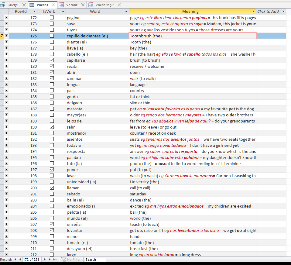 As you can see, one of the rows contains the translation for the word Toothbrush. The 'Meaning' field is set as long text, rich text format.