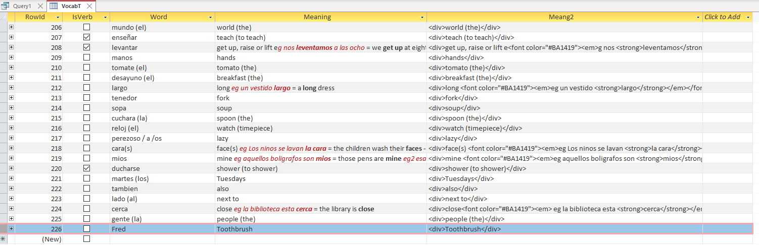 2021-02-24T13:49:16+00:00 Ok, so now I am a little bit closer to working out WHY it is happening, just not how to resolve it. It seems that, during developing this, I changed from plain text to rich text format. In doing so, Access appears to wrap <DIV> tags around everything, including the new record. I discovered this by creating a new, short text field as plain text and an update query to copy the contents of the [Meaning] field into it. This is what I see.