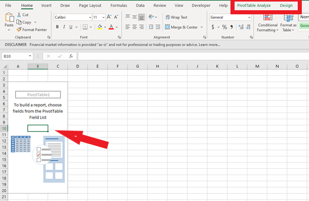 When you click inside the new pivot table, you should see PivotTable Tools, with two tabs: Analyze and Design.