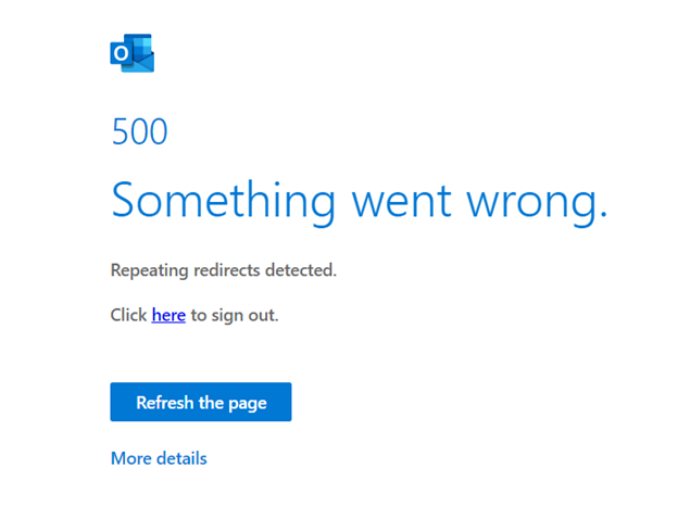 Trying to access a SharePoint team site through outlook also leads to a redirect error after about 30o seconds of redirecting (see image below).