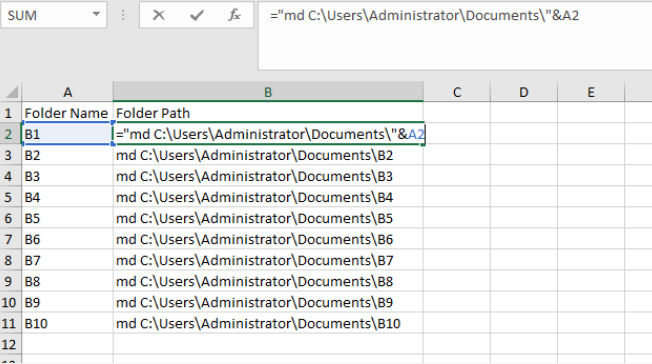 You can go to your Excel file and put the name of folders in column A, then you can go to column B and use the formula = "md Path"&A2. Please take note that path is the location on your computer you would like to create. For example, as shown below: