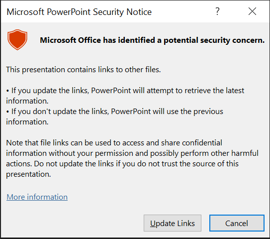 And if I closed the PowerPoint file and edited on the Excel chart file, then re-opened the PowerPoint file, the below window will pop up, and I clicked "Update Links", then