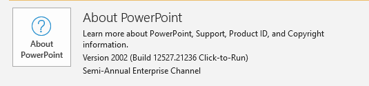 - The screenshot of your Office version(open Excel/PowerPoint> File > Account >capture a screenshot of the Product Information column).