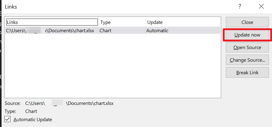 - If you go File > Info > Edit links to Files, select the link and click "Update now", will the charts be updated?