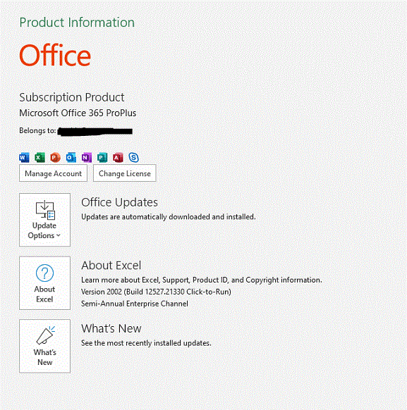 - Full screenshot of your Excel version? Open Excel > File > Account > Production Information and share a screenshot of it. (Please mask your private information.)