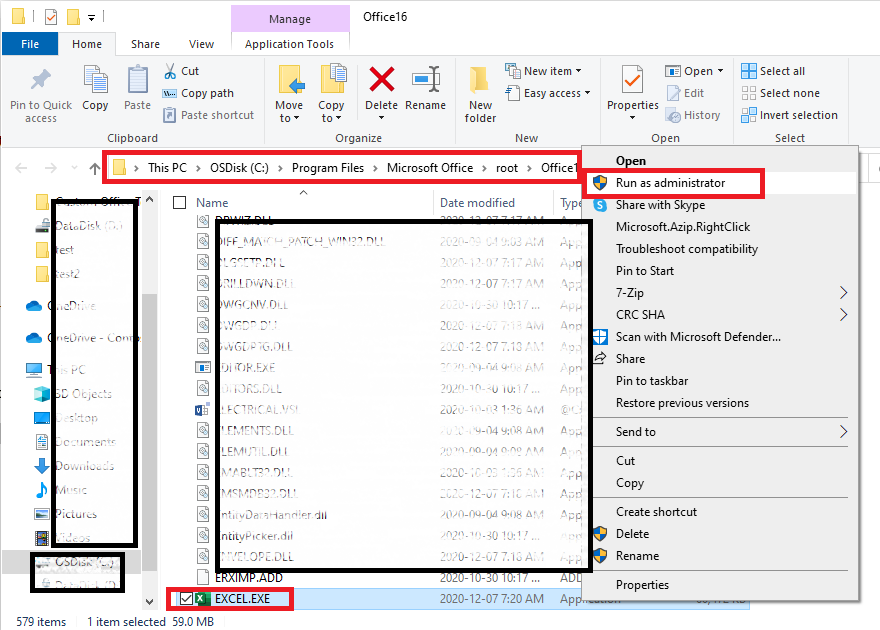 Right click on Excel.EXE> select Run as administrator and see if it helps.