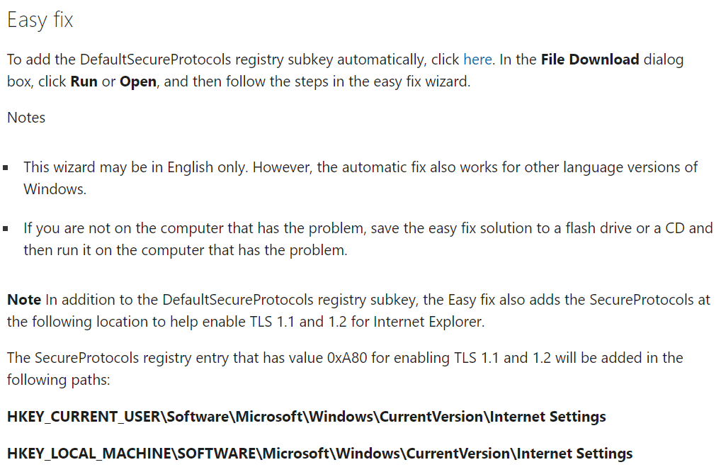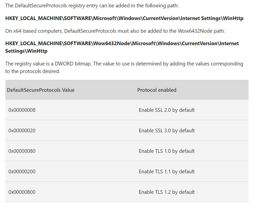 If yes, I suggest you try to update to enable TLS 1.2 as default secure protocols in WinHTTP in Windows.