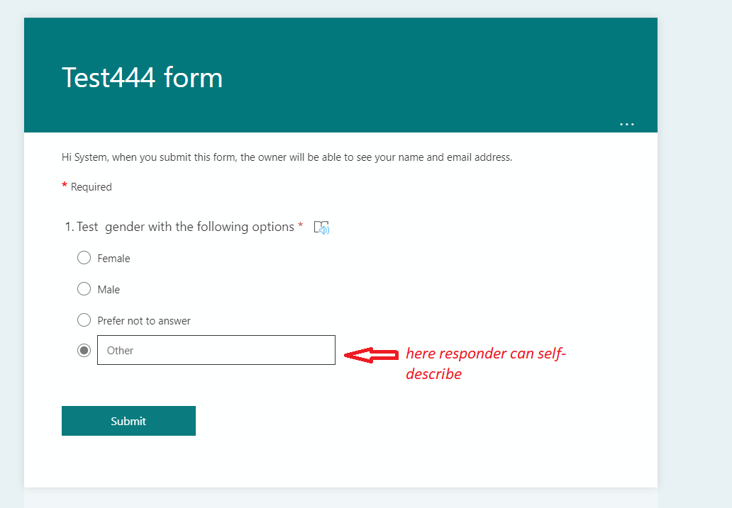 As per your description, “I'd like to change theoption which says 'Other' to display 'Prefer to self-describe’ based on my test regarding to “Other [text field]” of a multiple-choice question field in Microsoft form I'm afraid you cannot customize option. However, based on my test as a workaround you can addan "Other" optionin a choice question. This will add a text field in the question and enable responder to leave text message.