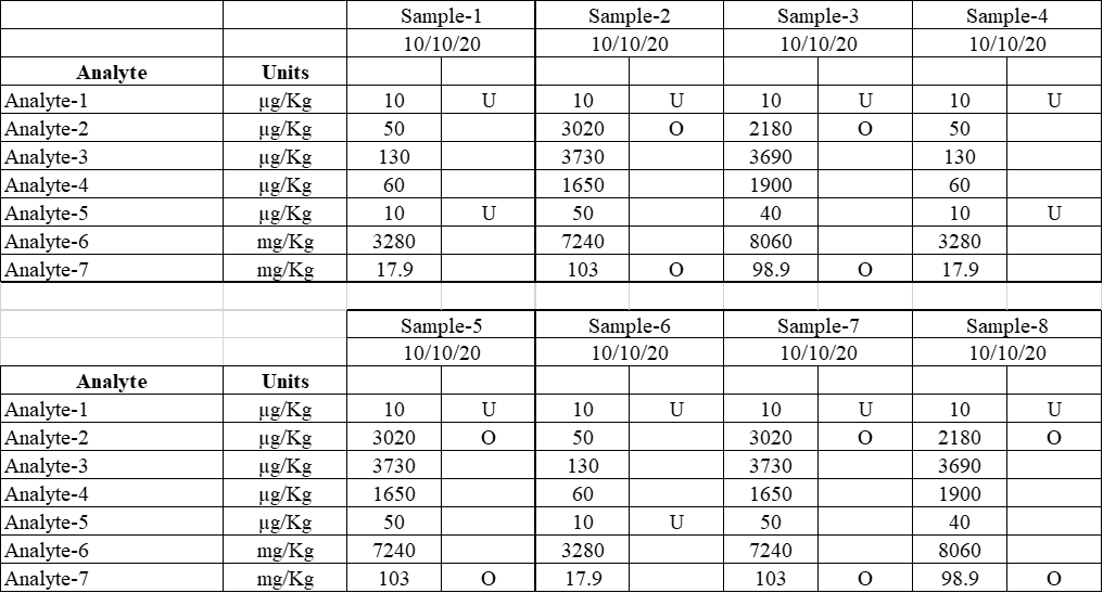 Click in the 'Columns to repeat at left' box, then select the left two columns (the ones with Analyte and Units).