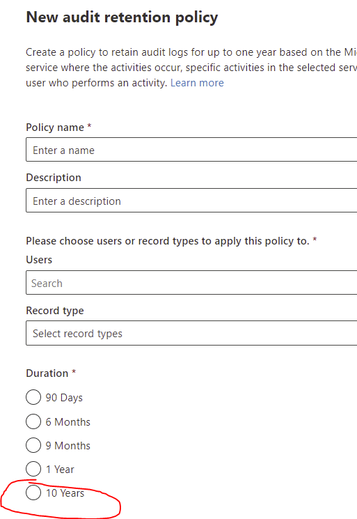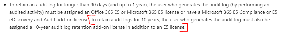 In my tenant, when I go to create a new audit retention policy, I can see the 10 Years option already so I am assuming that I have this feature enabled for having the O365/M365 E5 license. I do not have the 10 year retention period add-on.