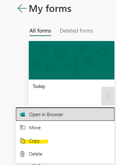 After clicking Ellipsis of forms, we can see Copy option, as shown below:
