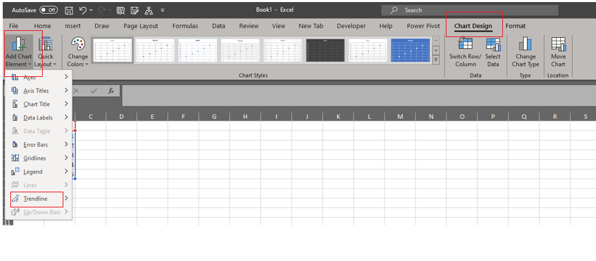 Open the Excel file with scatter chart> Click on the Chart> Chart Design in the Ribbon> Add Chart Element in the Chart Layouts sections> Trendline.