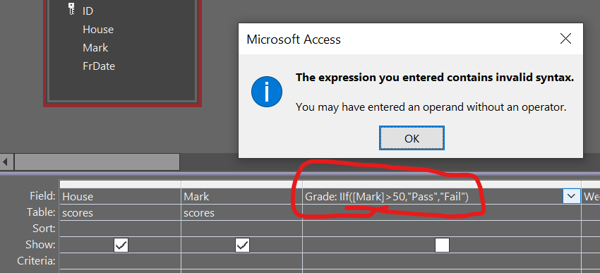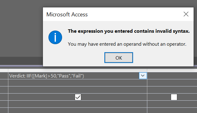 But Access returns a syntax error. I have tried the IIF statement with Dates it works. I can even add marks onto existing mark, meaning all functions works but only when the logic test has to deal with numbers then I have a problem. Please help!!!