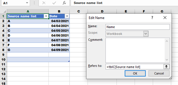 Here is a demo I created. The table I created was named as tbIC. Go to Formula tab > Define name > define a name to your column in the table. Here I defined “Source name list” column as “Name“ in my table.