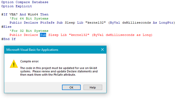 #If VBA7 Then Declare PtrSafe Sub Sleep Lib "kernel32" (ByVal dwMilliseconds As LongPtr) #Else Declare Sub Sleep Lib "kernel32" (ByVal dwMilliseconds As Long) #End If -