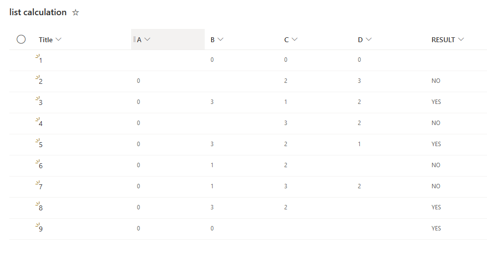 Moreover, we created another 4 single line text columns named A,B,C and D with a Calculated column named RESULT. Here is the formula and the result we got: