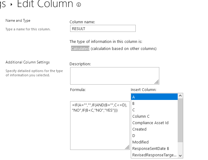We tested at my end by using the formula you provided above, =IF([RevisedResponseTargetDate A]="","",IF(AND([ResponseSentDate B]="",[Column C]<[Todays Date]), "No",IF([ResponseSentDate B]>[Column C],"No","Yes")))). We got syntax error if we set ResponseSentDate, RevisedResponseTargetDate and Todays Date as Date and Time type. Moreover, there are only 3 items in this formula so I think column C is missing in it.
