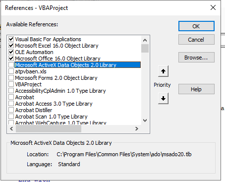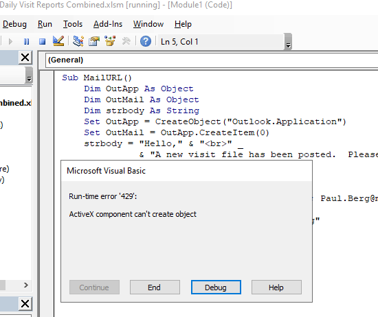 A few days ago I started to receive this error when I ran this macro. I tried making Active X automatic, I tried re registering DLLs...I did a clean install on O365 STILL nothing. I have an existing file which has code that interacts with the Outlook.Application object. When I paste this code in there, it works. When I create a new workbook or use the existing file which the file resides in. This does not work. I haven't have the slightest clue why it works in one of my files but not this one. I really need this code to work but have ran out of options. Please help