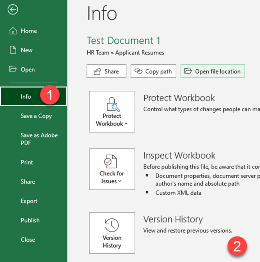 - Open the file in Excel client>File>Infro>version history to see the result.