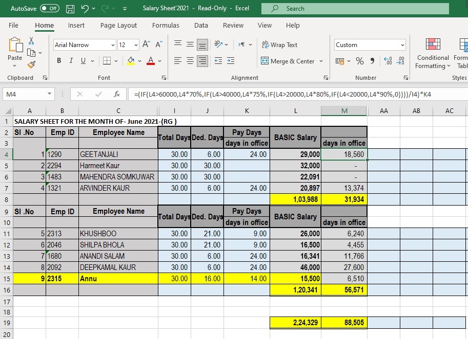 Employees SI No. 1, 4, 7, and 8, worked 24 days in the month, they should be entitled to get their full BASIC monthly salary plus two extra days of their salary worth. (obviously before any tax % deductions)