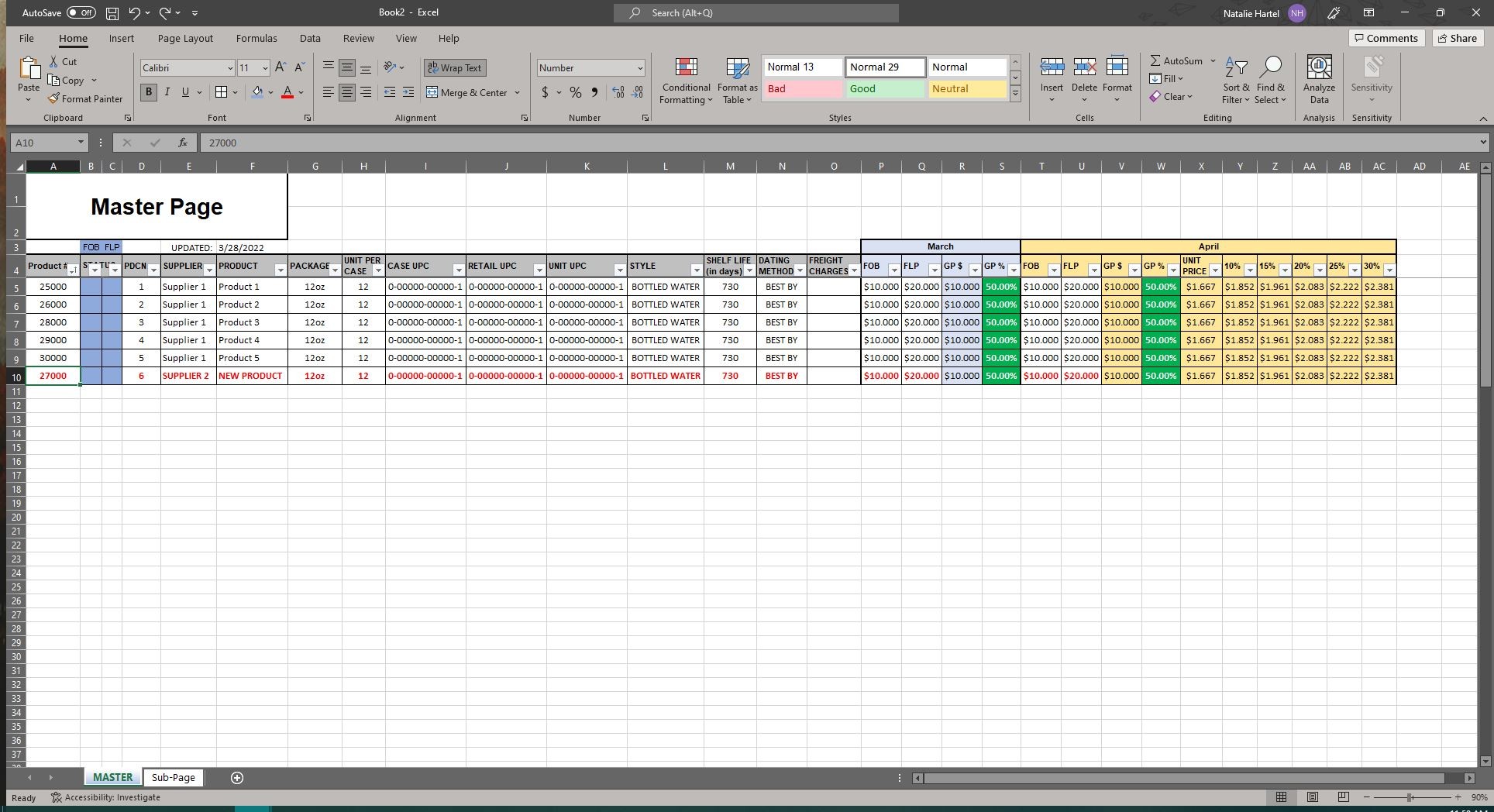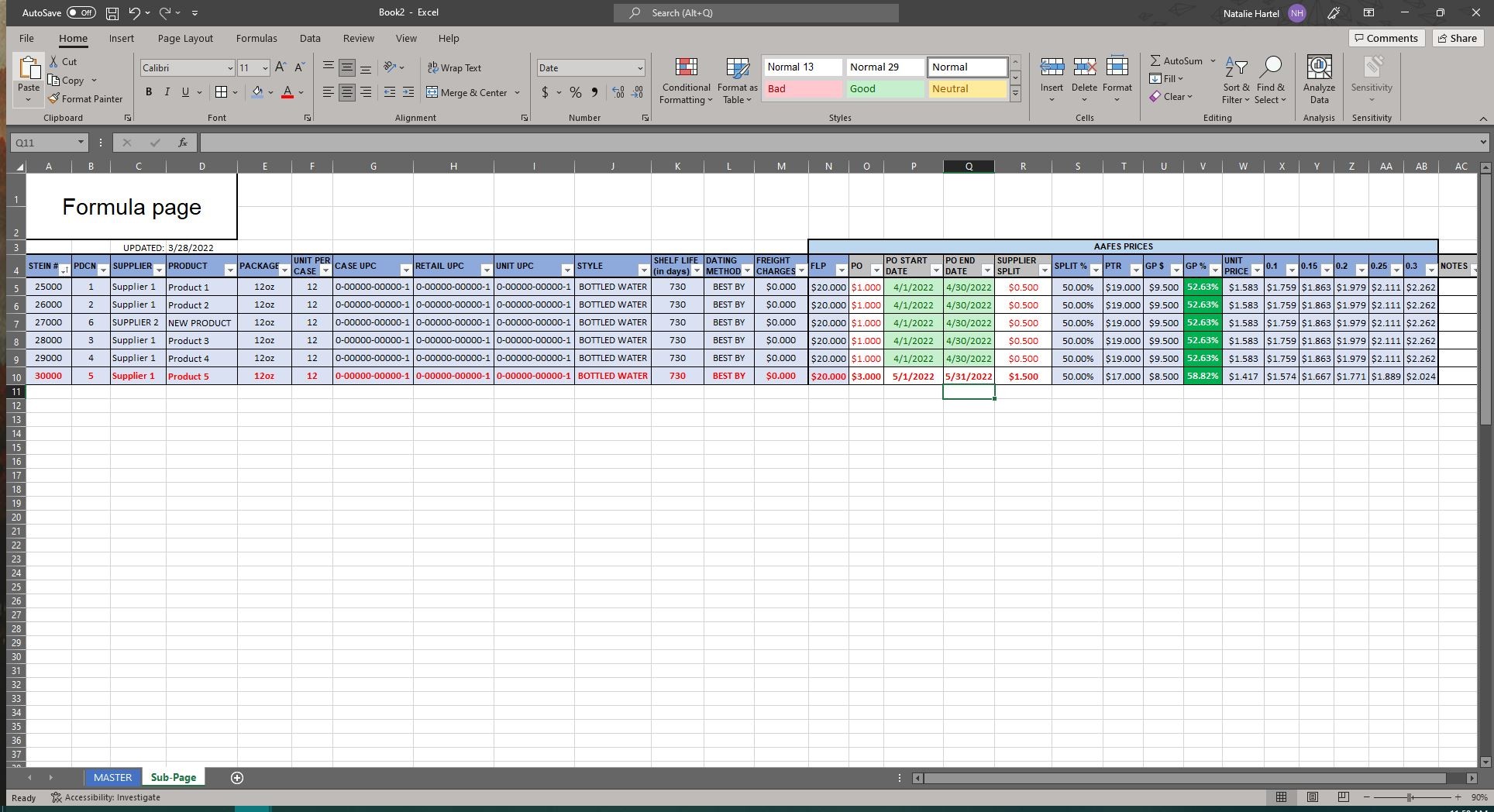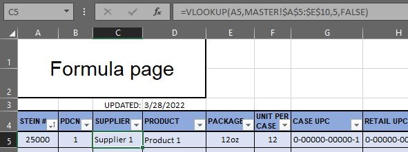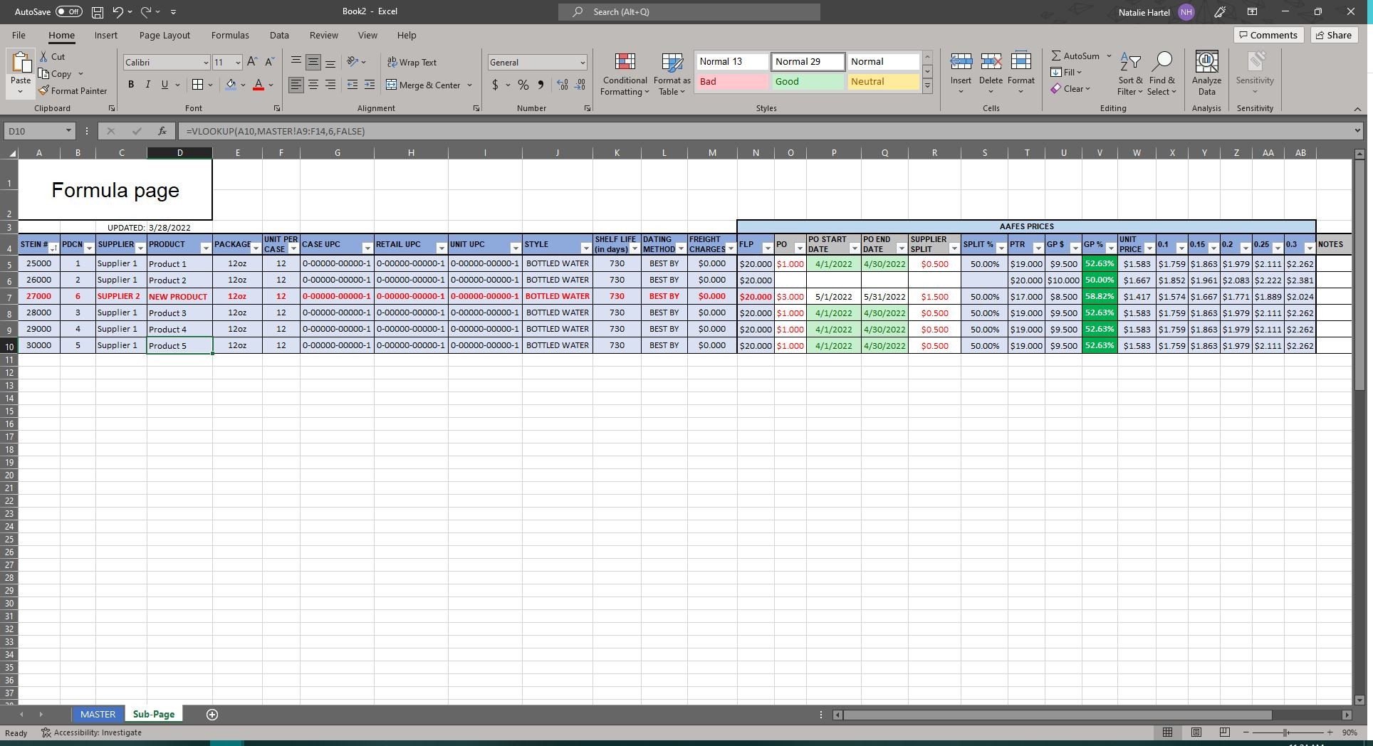 The second sheet is the Sub-Page. Here, column A is a straight ='s formula that references the Product Number in column A on the Master sheet. Columns B-N are VLOOKUPS that reference Sub-Page's column A to pull in information from the Master sheet. Columns O-R and AC are values that I input (no formulas) and columns S-AB are calculation formulas (no VLOOKUPS). See screenshot below.