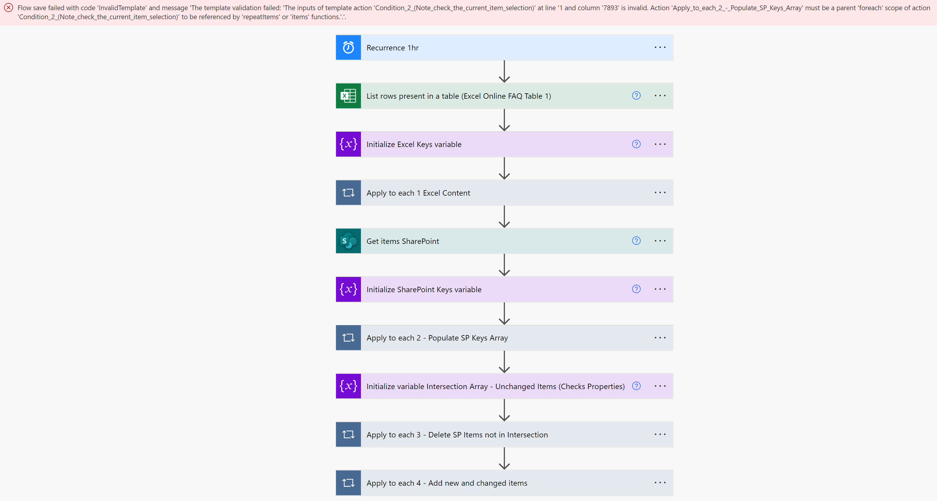 Flow save failed with code 'InvalidTemplate' and message 'The template validation failed: 'The inputs of template action 'Condition_2_(Note_check_the_current_item_selection)' at line '1 and column '7893' is invalid. Action 'Apply_to_each_2_-_Populate_SP_Keys_Array' must be a parent 'foreach' scope of action 'Condition_2_(Note_check_the_current_item_selection)' to be referenced by 'repeatItems' or 'items' functions.'.'.
