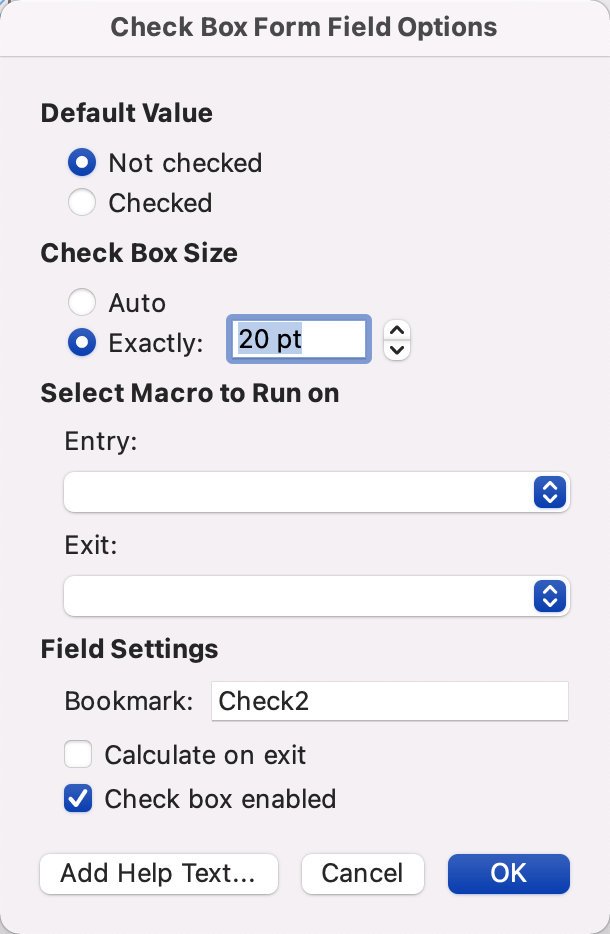 Based on my test result, check boxes that I can click to fill with an "x” after select Protect Form, when I click a check box, it is filled with an "x" in Word for mac OS.