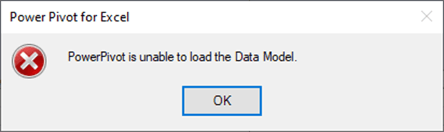 When I try to do anything that uses the Data Model (click on a pivot table using Data Model data, refresh a query, etc..): "An issue with the Data Model is preventing Microsoft Excel from opening this workbook. Try restarting Microsoft Excel."