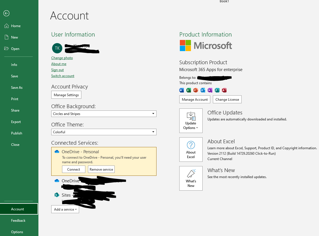 1)Can you provide the screenshot of Excel product information for us? Open Excel>File>Account to give a screenshot.