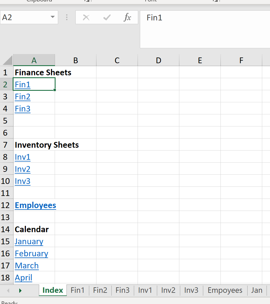 Out on each of the individual sheets, create a link back to the Index page as shown far below. Once created, copy that cell and paste it in the same place on every one of the other sheets in your document.