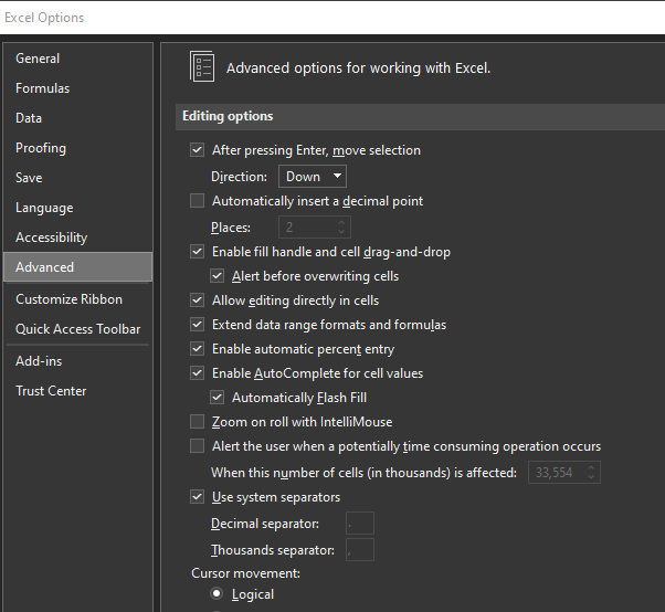 I have lost the text cursor in the excel cells. How do you get the flashing text cursor to show in excel cells again it shows in the formula bar and in other Office apps just not in the excel app. I have shut down, did a Microsoft repair. Changed the mouse settings, used the advanced options in the Excel file options. Nothing has worked. Please help.